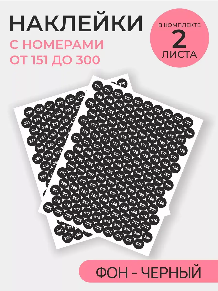В комплекте два листа наклеек (всего 300 штук) в прочном полиэтиленовом пакете с твердой подложкой для безопасной доставки. В комплекте парные номера от 150 до 300, а типсы и баночки на фотографиях служат лишь для демонстрации продукта и не входят в набор.