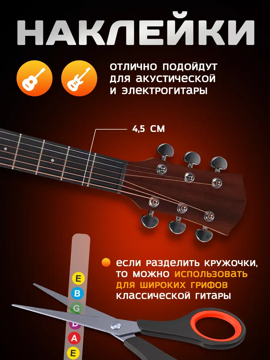 Наклейки могут использоваться на шестиструнных инструментах разной ширины. Если гриф классической гитары шире 4,5 сантиметров, стикер можно разделить на две части. При необходимости наклейки можно легко удалить, не оставив следов на гитаре.