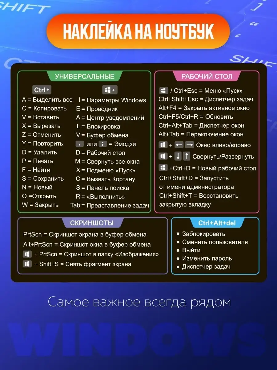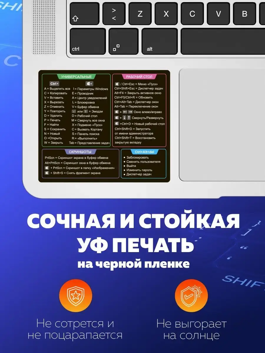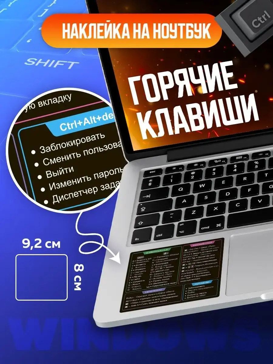 Наклейки подсказки для ноутбука "Сочетания горячих клавиш клавиатуры Windows" на русском языке существенно поможет ускорить работу в системе. Не нужно постоянно обращаться к справке в интернет, все самое необходимое - под рукой. Размер у ниверсальный, подходит для свободного пространства слева или справа от тачпада ноутбука. Основа - виниловая пленка. Изображение: устойчивая к солнцу УФ печать.