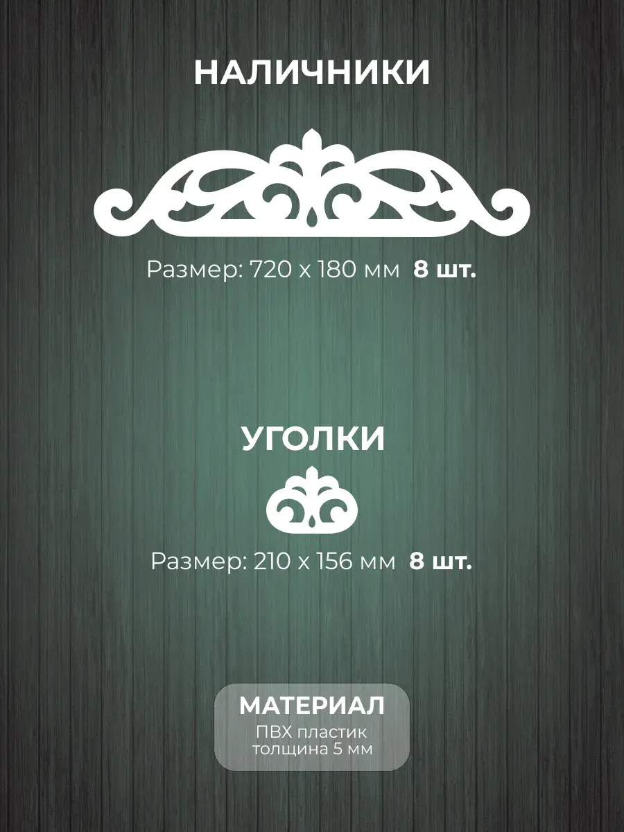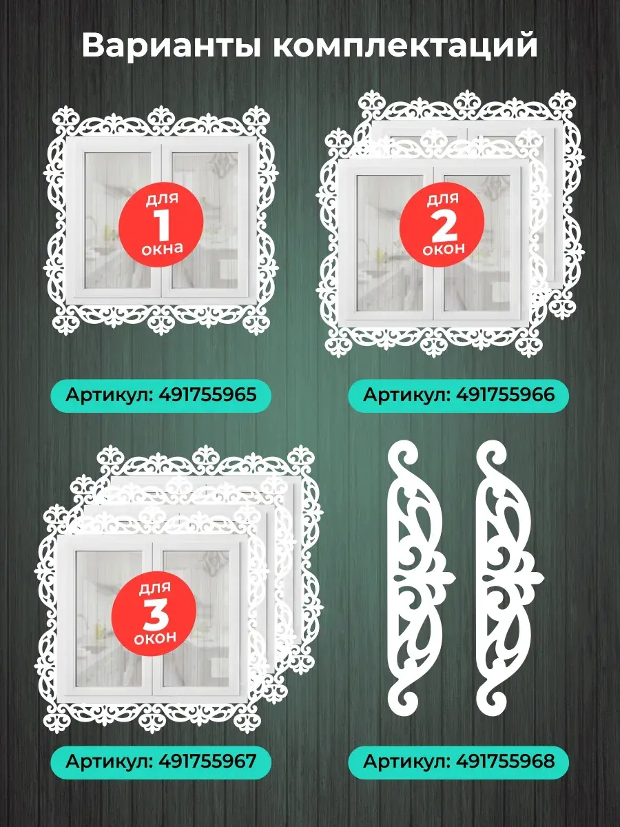 В данном комплекте 8 деталей для оформления для 1 окна. Изготовленные из высококачественного пластика 5 мм, наличники обладают высокой прочностью, устойчивостью к влаге, в отличие от деревянных деталей и ультрафиолетовому излучению.