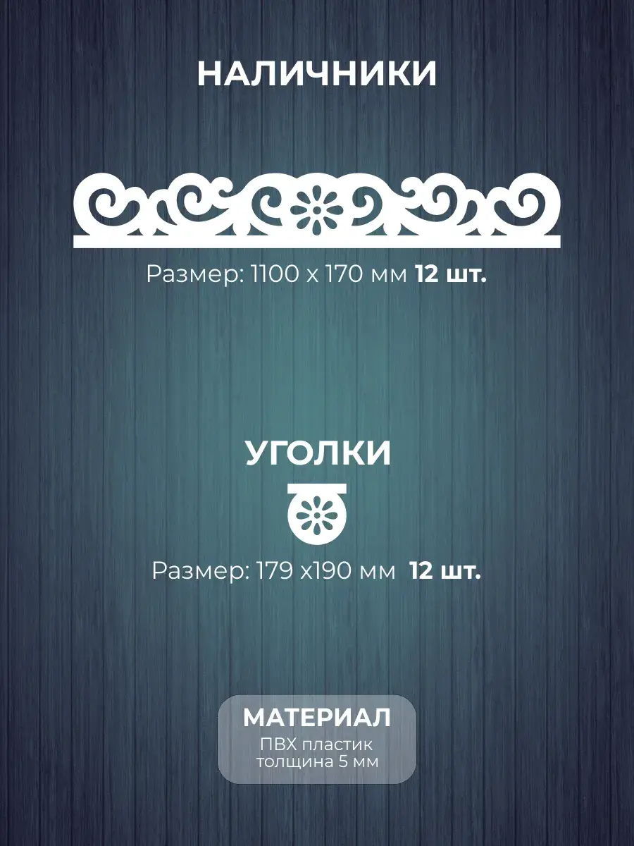 В данном комплекте 24 детали для оформления для 3 окон. Изготовленные из высококачественного пластика 5 мм, наличники обладают высокой прочностью, устойчивостью к влаге, в отличие от деревянных деталей и ультрафиолетовому излучению.