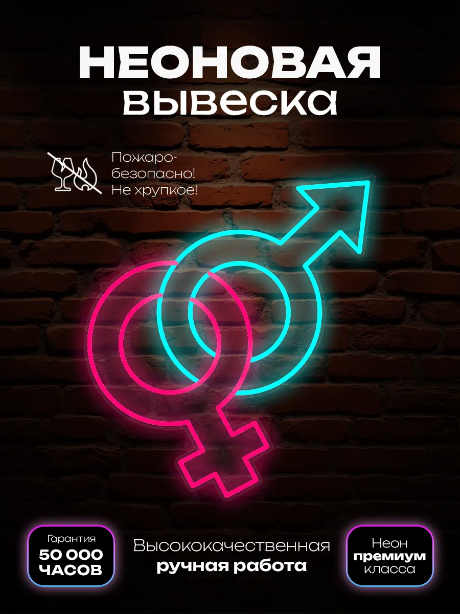 Дизайн изделия подчеркивает нюансы тематики мужское-женское. Конструкция данной неоновой вывески обеспечит равномерное мягкое освещение без мерцания, создавая эффектную визуальную доминанту. Благодаря простому способу настенного крепления, размещение возможно без профессиональных навыков. Лёгкий корпус неонового светильника устойчив к механическим воздействиям и рассчитан на долговременную эксплуатацию. Изделие не греется в процессе работы, полностью безопасно для размещения в жилых и общественных пространствах.