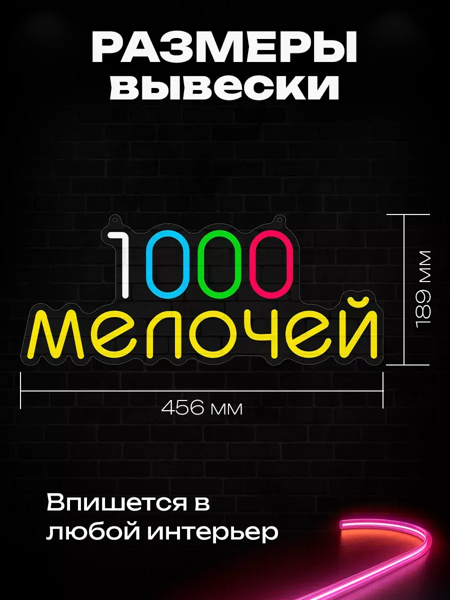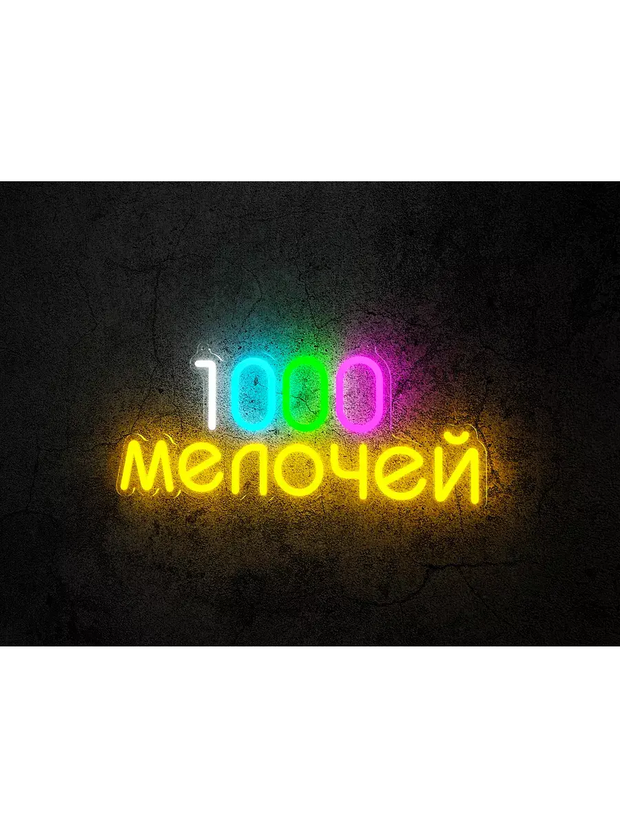 Наша неоновая вывеска "1000 мелочей" станет ярким и функциональный элемент дизайна магазина. Разноцветное неоновое свечение создает динамичный и привлекательный образ для потенциальных покупателей.