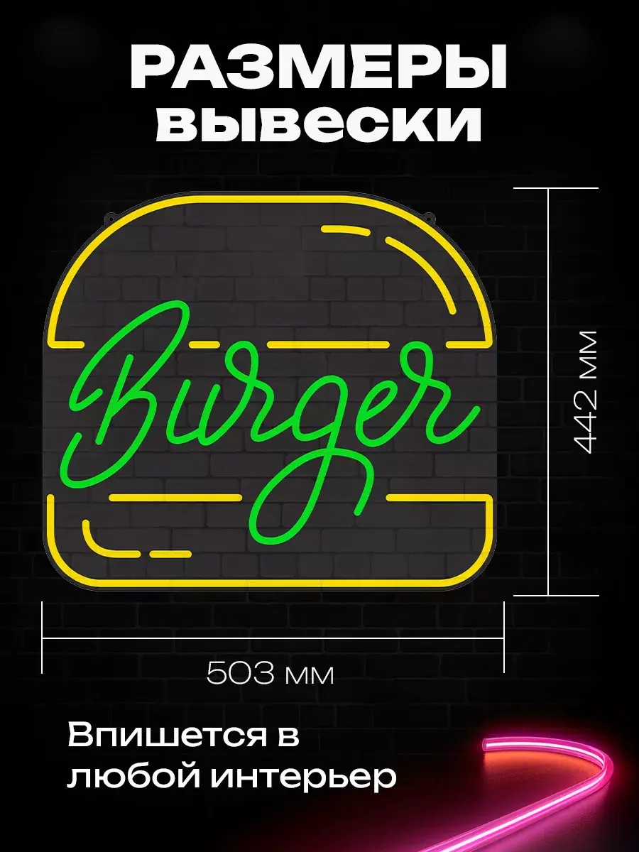 Неоновая вывеска с ярким изображением"Burgerа" станет идеальным акцентом для кафе, бистро или магазина, предлагающего вкусные бургеры. Вывеска может быть установлена на окно, стол или стену, добавляя атмосферу тепла и уюта. С такой вывеской ваше заведение будет заметно выделяться на фоне конкурентов и привлекать новых посетителей.