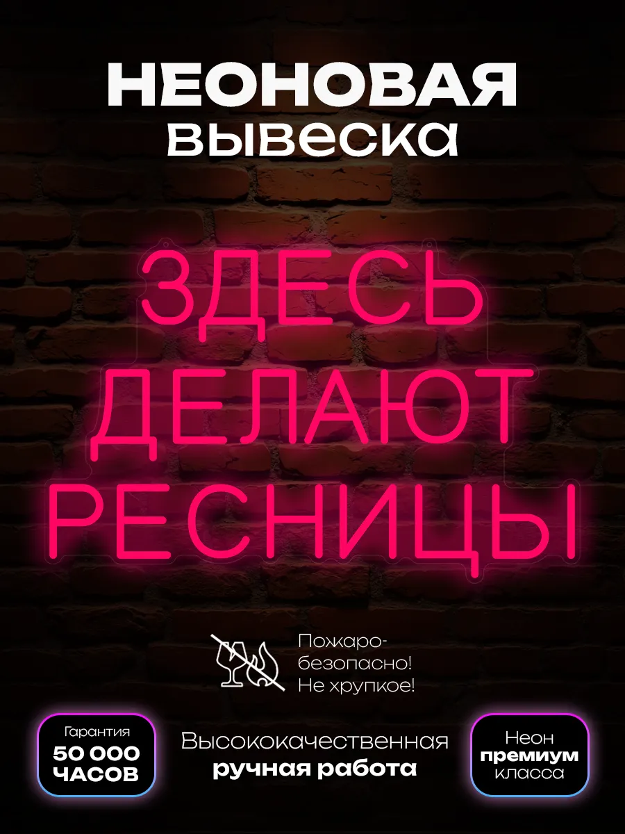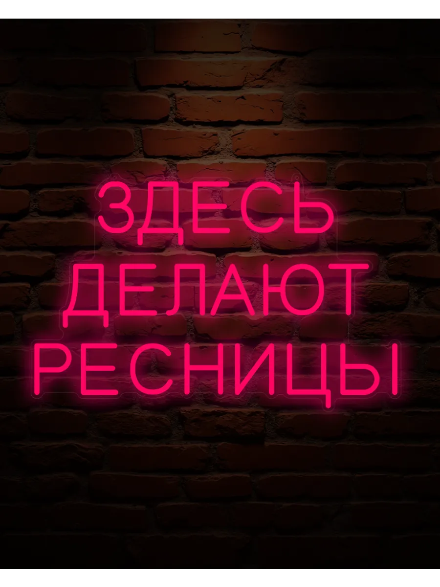 Неоновая вывеска «Здесь делают ресницы» — это потрясающее зрелище, особенно в тёмное время суток. Она создаёт неповторимую сказочную атмосферу и привлекает внимание клиентов.