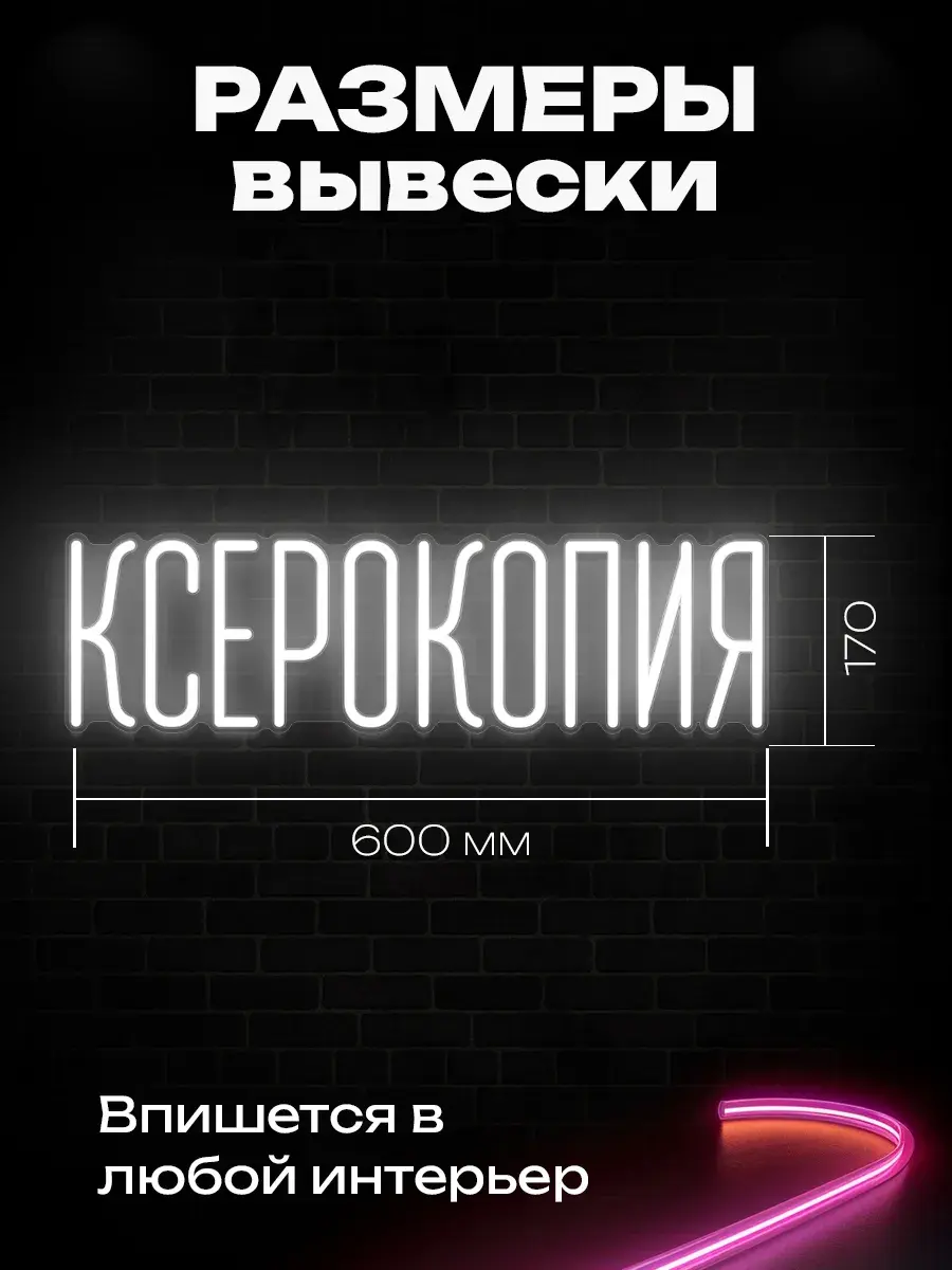 Неоновая вывеска в виде слова “Ксерокопия”, ярко светящаяся в темноте. Буквы выполнены из неона, который создает потрясающее световое шоу, особенно заметное в темное время суток. Вывеска служит не только украшением интерьера, но и функционально указывает на то, что заведение готово принимать посетителей.