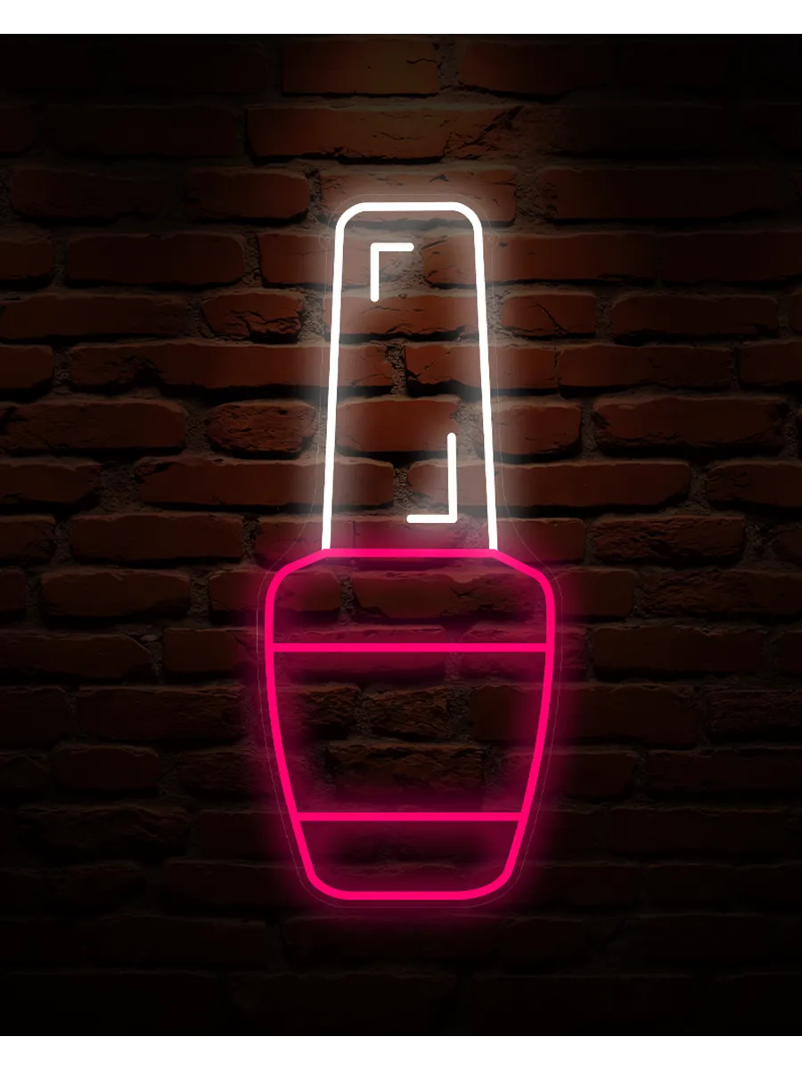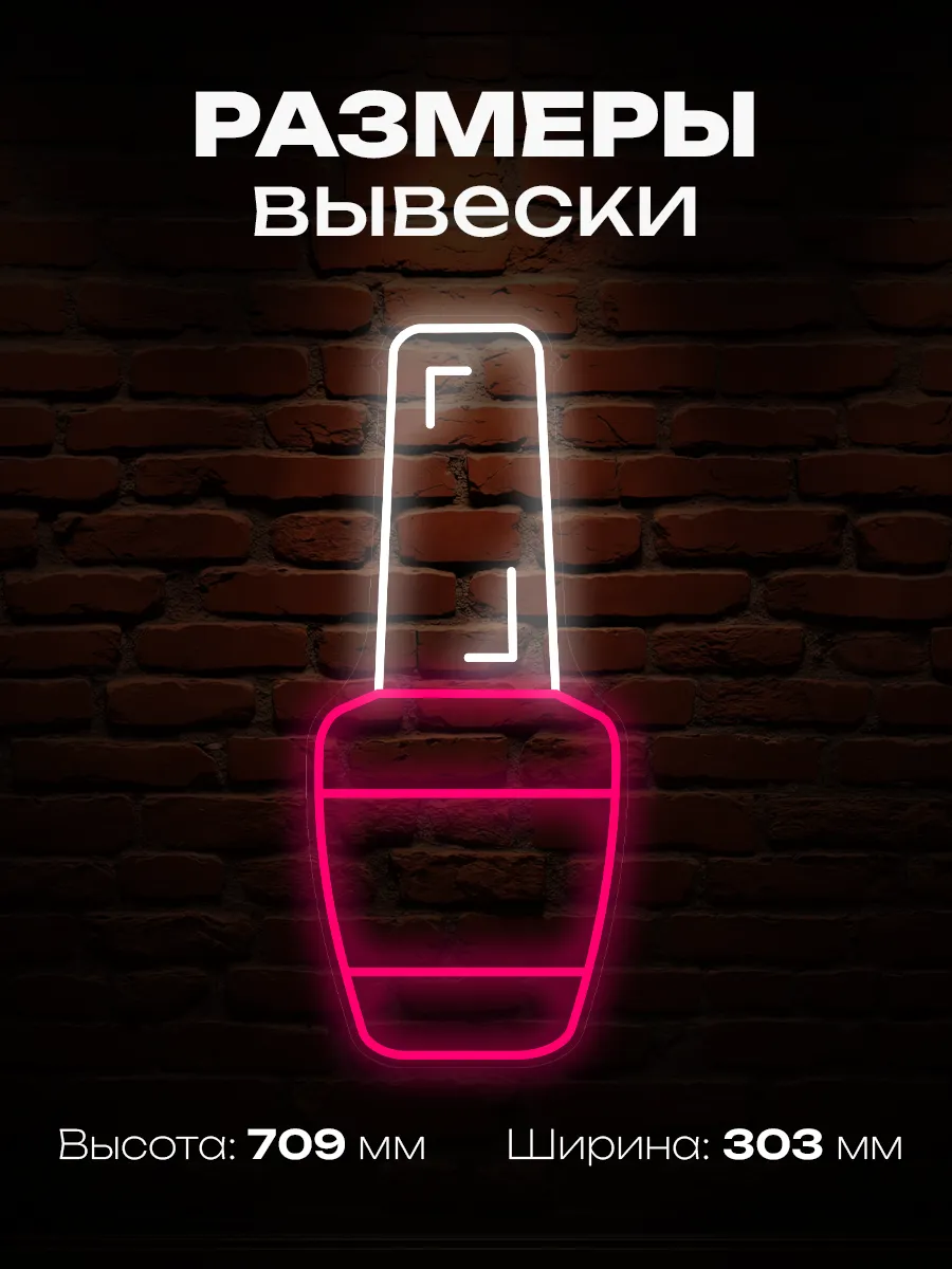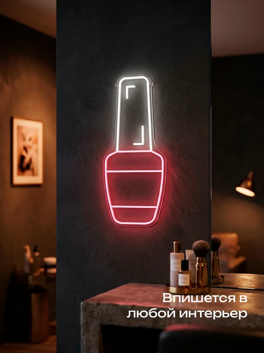 Неоновая вывеска «Лак для ногтей» — это потрясающее зрелище, особенно в тёмное время суток. Она создаёт неповторимую сказочную атмосферу и привлекает внимание клиентов.