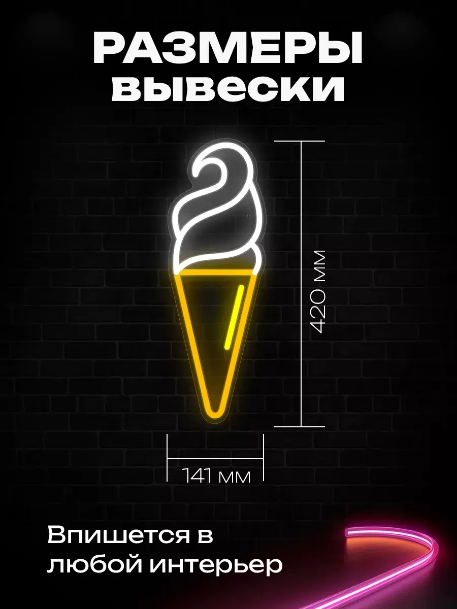 Летом вас будет привлекать вывеска «Мороженое». Она выполнена в виде большого рожка с тремя разноцветными шариками мороженого. Для изготовления этой вывески мы использовали неон 2.0.