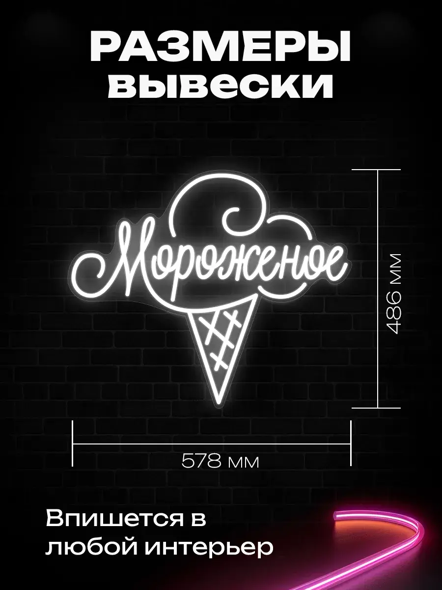 Летом вас будет привлекать вывеска «Мороженое». Она выполнена в виде большого рожка с тремя разноцветными шариками мороженого. Для изготовления этой вывески мы использовали неон 2.0.