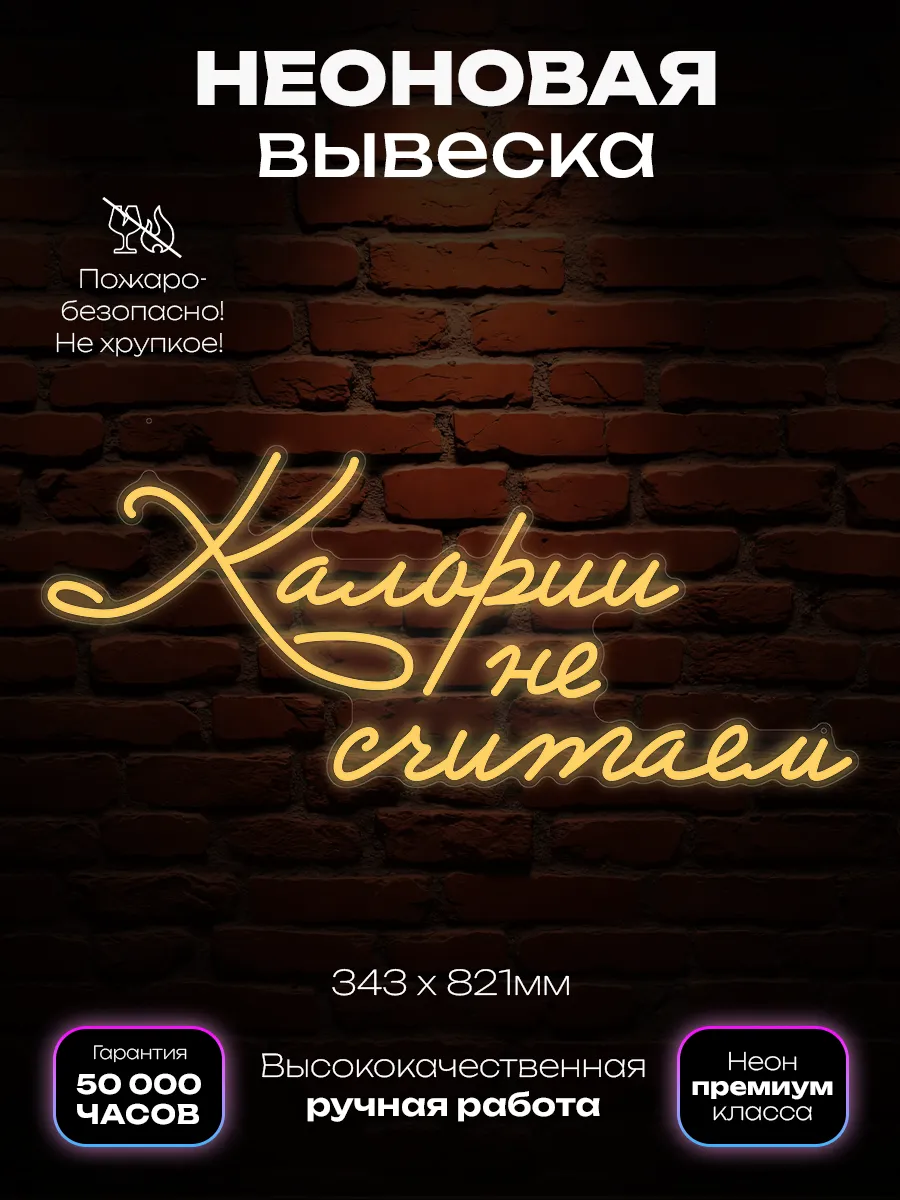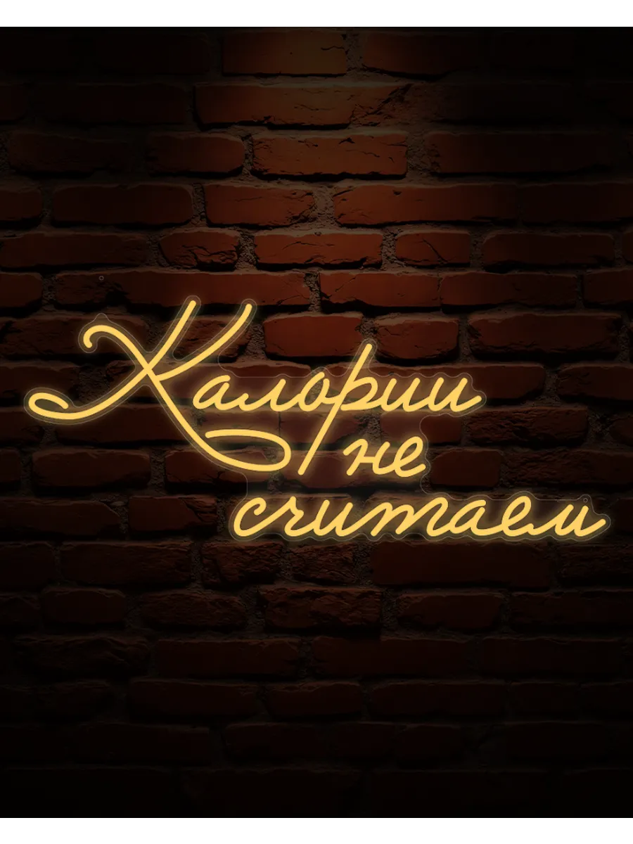 Компактные размеры изделия позволяют легко интегрировать модель в любой дизайн, а стойкая подсветка обеспечивает долгий срок эксплуатации без потери яркости. Неоновая вывеска с надписью «Калории не считаем» — это не только стильный декоративный элемент, но и эффективный способ сделать ваше пространство узнаваемым и привлекательным.