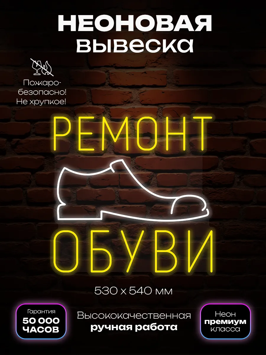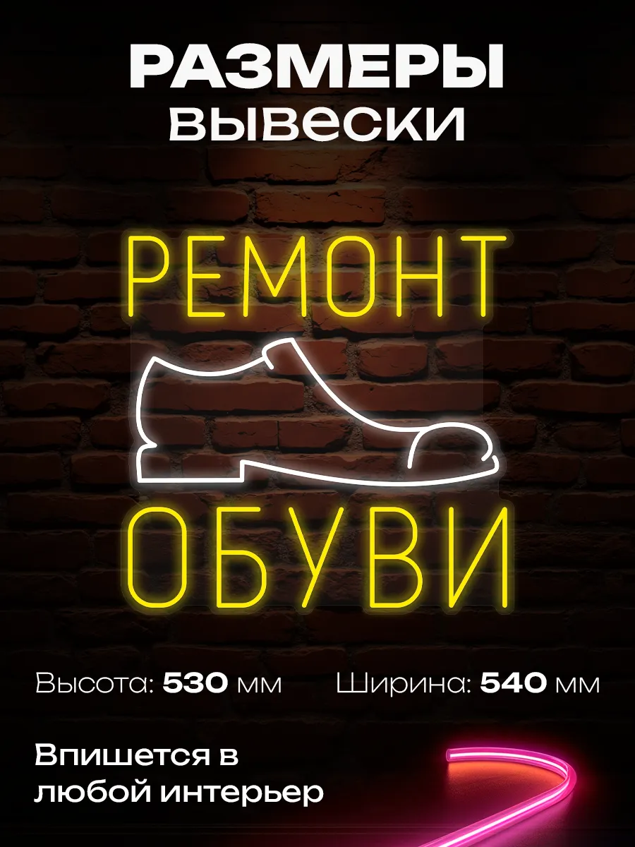 Данный вариант неоновой вывески подойдет как для новых торговых точек, так и для обновления существующих магазинов или мастерских, связанных с ремонтом и обслуживанием обуви. Прочный монтажный комплект поставляется в комплекте, что упрощает процесс установки на выбранной поверхности. Неоновая вывеска с лаконичной надписью становится неотъемлемой частью узнаваемого образа современного бизнеса в сфере ремонта обуви.