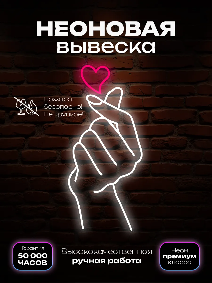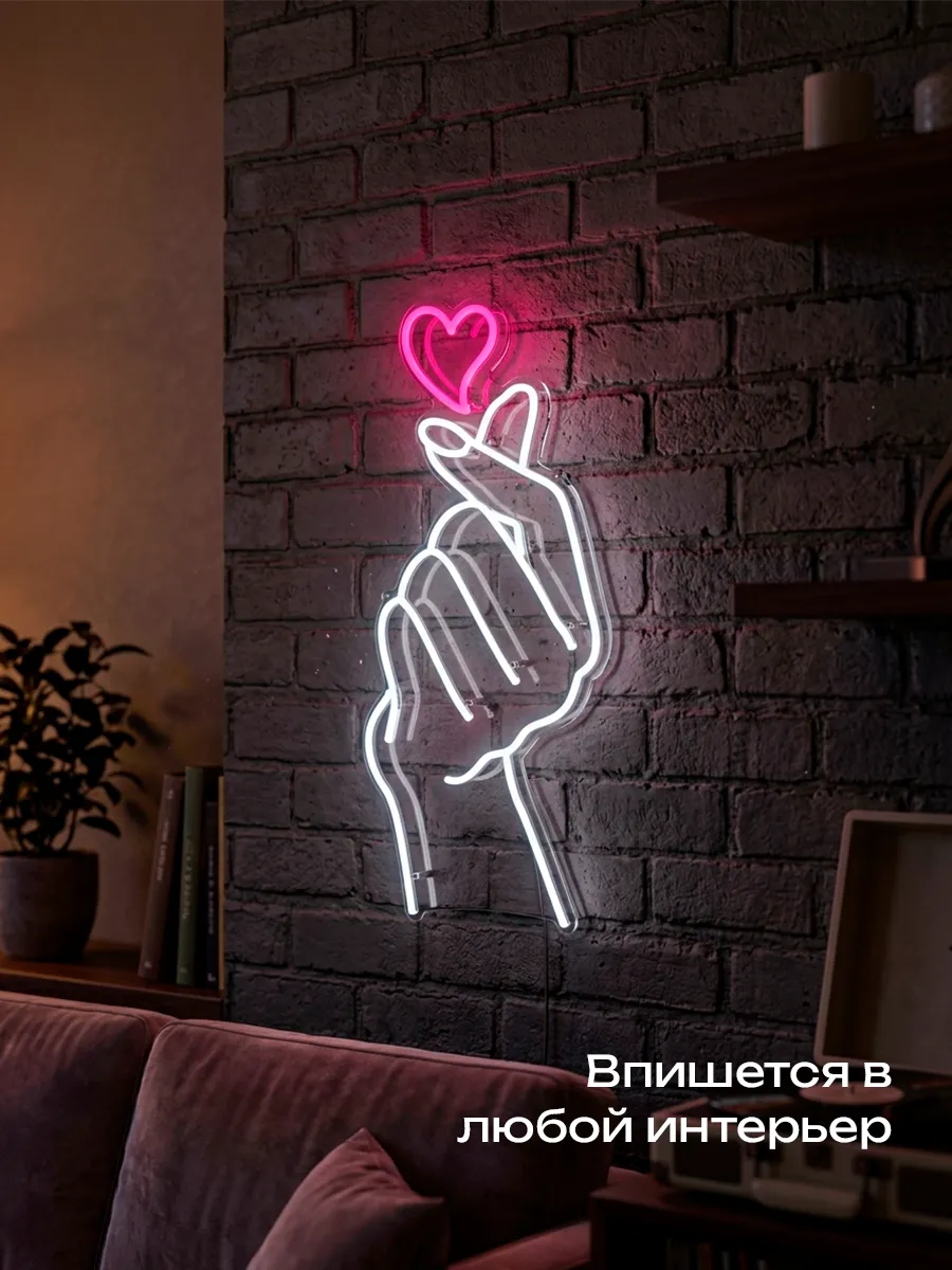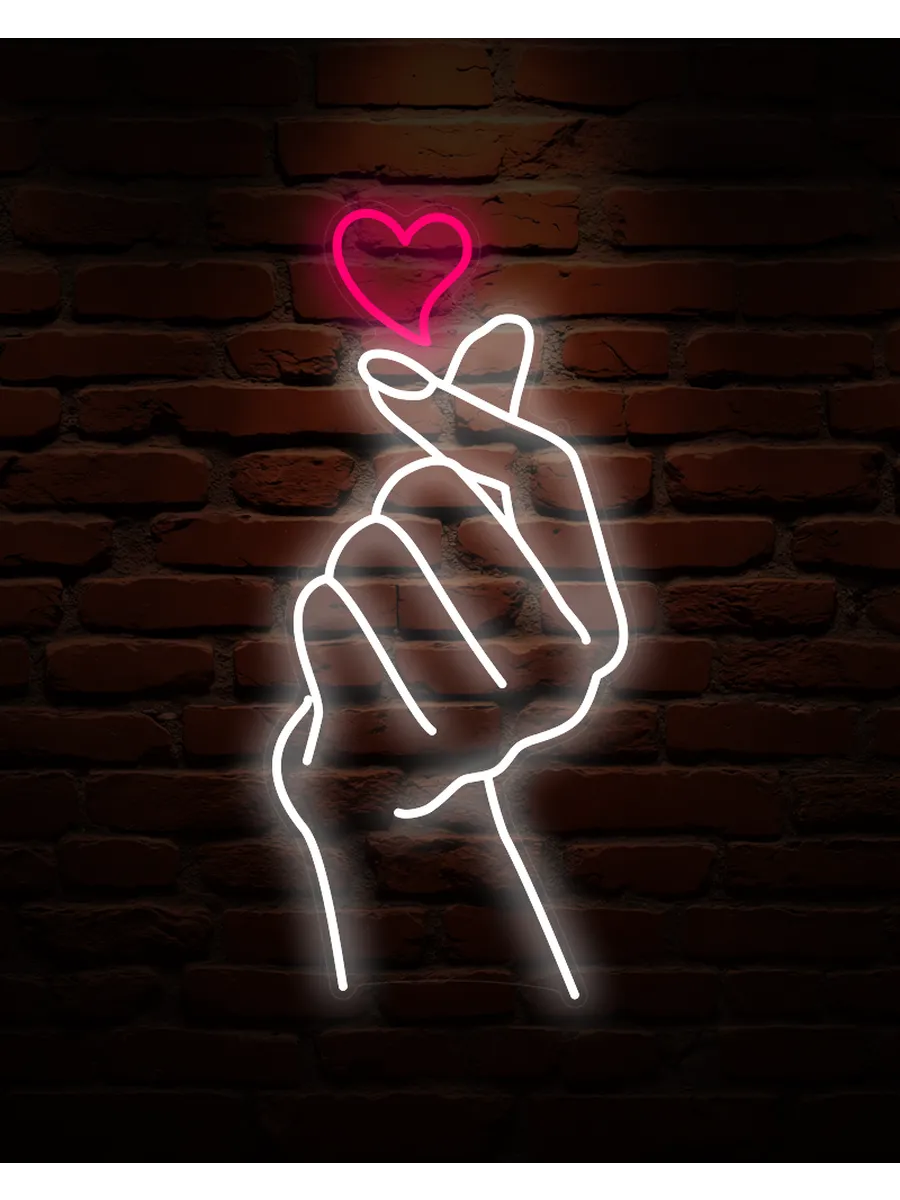 Неоновая вывеска «Рука с сердцем» — это потрясающее зрелище, особенно в тёмное время суток. Она создаёт неповторимую сказочную атмосферу и привлекает внимание клиентов.