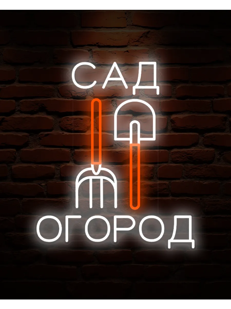 Эффектная неоновая вывеска "Сад Огород" станет отличным решением для оформления магазина товаров для сада и огорода. Современная неоновая технология обеспечивает равномерное, стабильное и привлекающее внимание свечения. Настенный монтаж вывески облегчает размещение как на фасаде, так и внутри помещения, в зоне окна или у входа в отдел, обеспечивая максимальную видимость издалека.