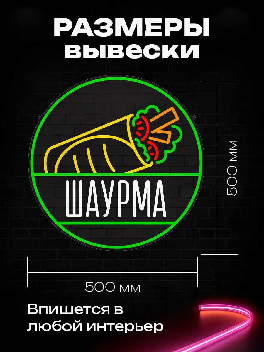Неоновая вывеска “Шаурма” - это потрясающее зрелище, излучающее яркие и сочные цвета. Она украшает окно небольшого уютного кафе, приглашая прохожих насладиться вкусом настоящего восточного блюда.