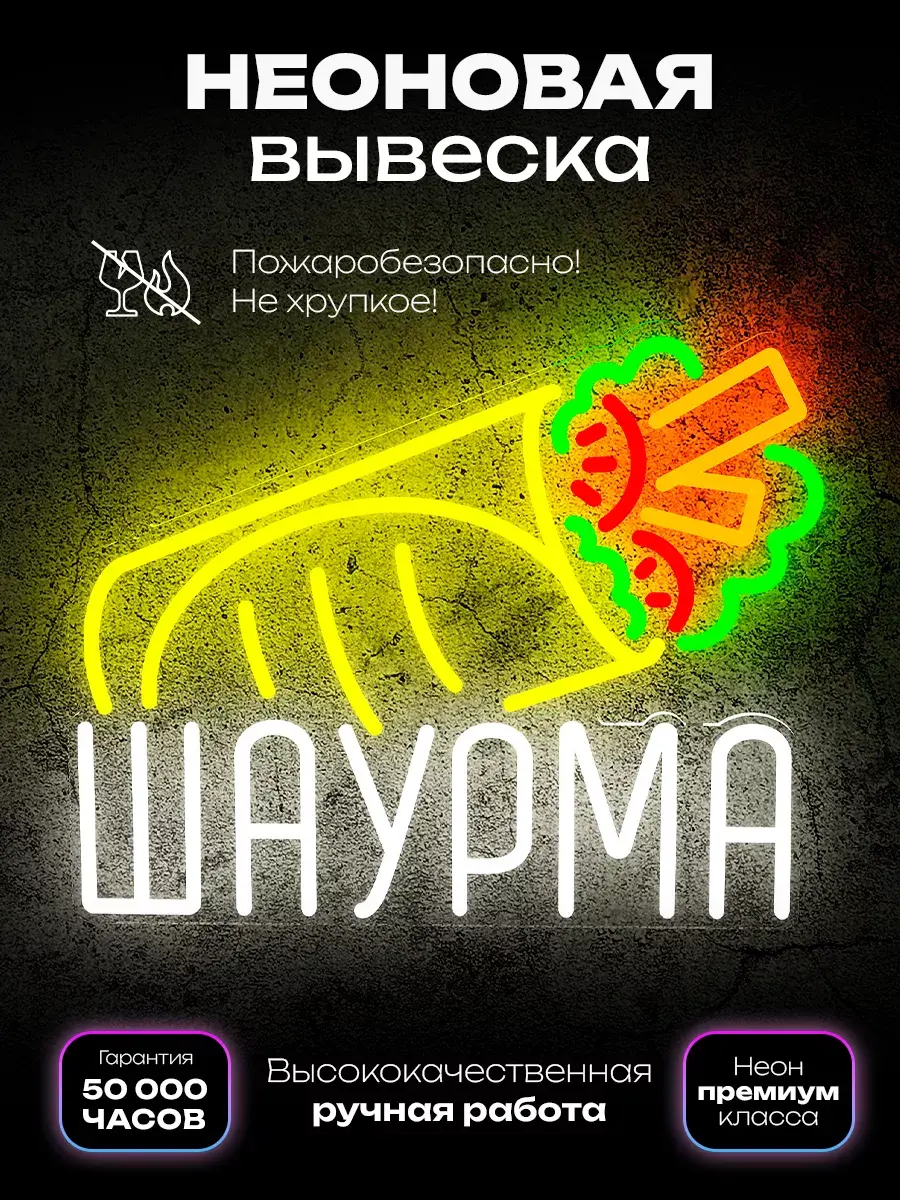 Неоновая вывеска "Шаурма" – это потрясающее зрелище, излучающее яркие и сочные цвета. Она украшает окно небольшого уютного кафе, приглашая прохожих насладиться вкусом настоящего восточного блюда.