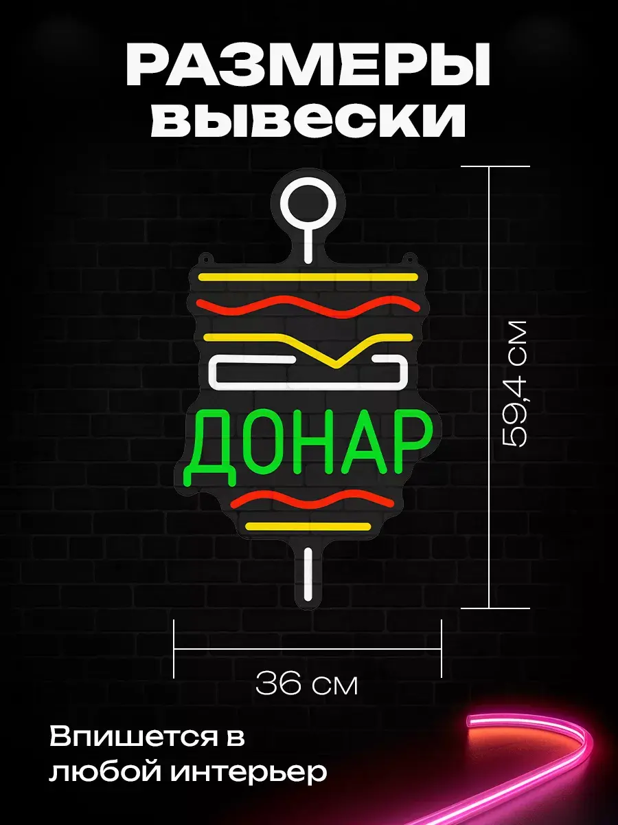 Неоновая вывеска «Шаверма ДОНАР» ярко-жёлтого цвета выполнена из неона 2.0 и предназначена для установки внутри помещения. Она имеет размер 360х594 мм и изготовлена из качественного комбинированного неона (ПВХ + силикон). Вывеска оснащена светодиодной подсветкой и работает от сети 220 В.