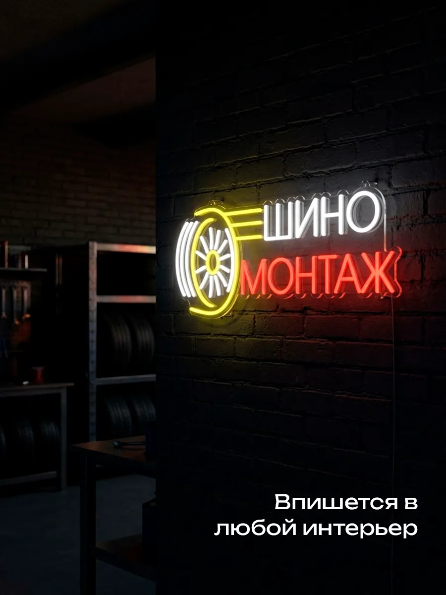 Современная неоновая вывеска "Шиномонтаж" предназначена для оформления фасадов и интерьеров автосервисов, шиномонтажных мастерских и магазинов автозапчастей. Благодаря высококачественному неону создается яркий и привлекательный эффект, который привлекает внимание клиентов и повышает узнаваемость заведения. Компактная небольшая неоновая вывеска легко устанавливается на стену, подходит для оформления окна, а также над входом. Неоновый настенный светильник выделяет важную информацию, создавая запоминающуюся атмосферу и усиливая визуальное восприятие.