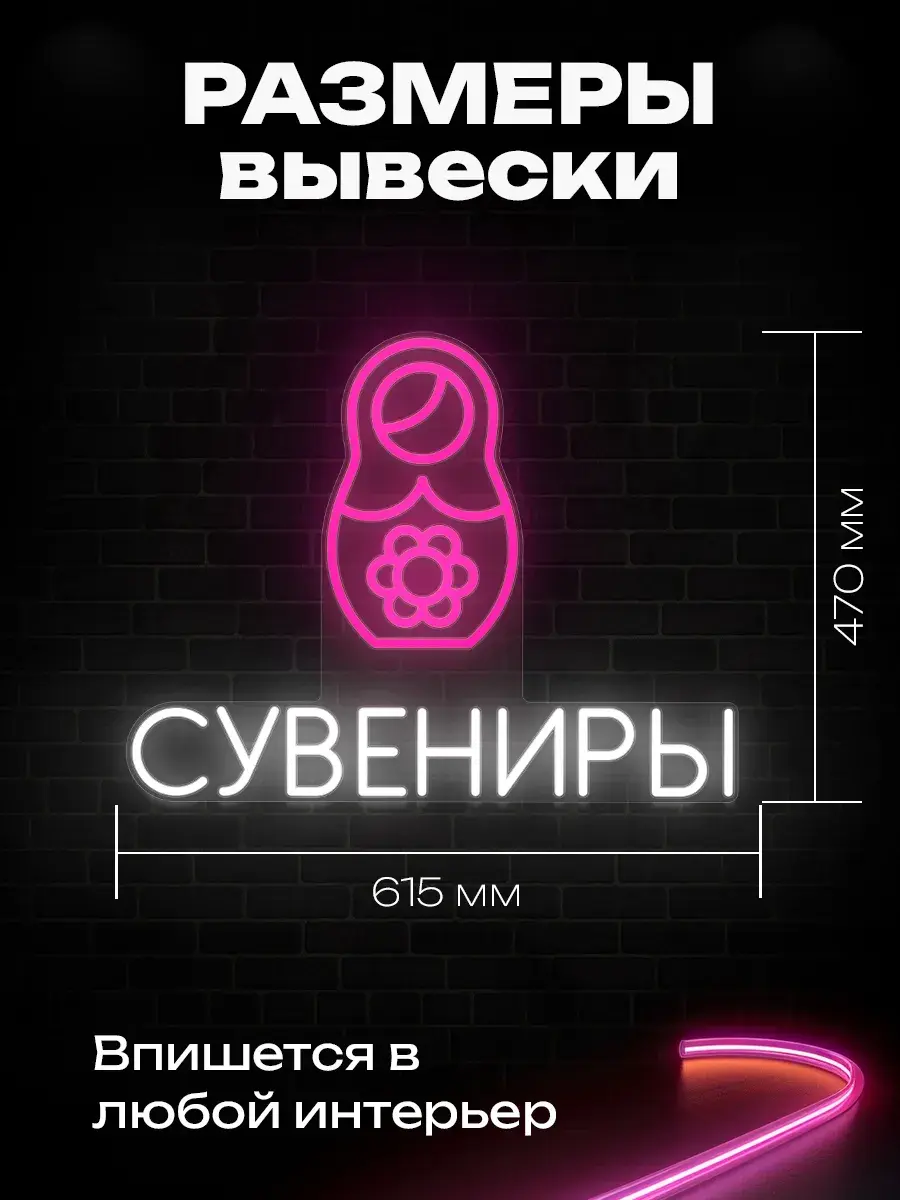 Неоновая вывеска «Сувениры» — это не только информационный элемент, но и стильный акцент, который поможет вашему бизнесу выделиться из толпы. Будьте заметными и привлекательными для своих клиентов с этой яркой и современной вывеской.