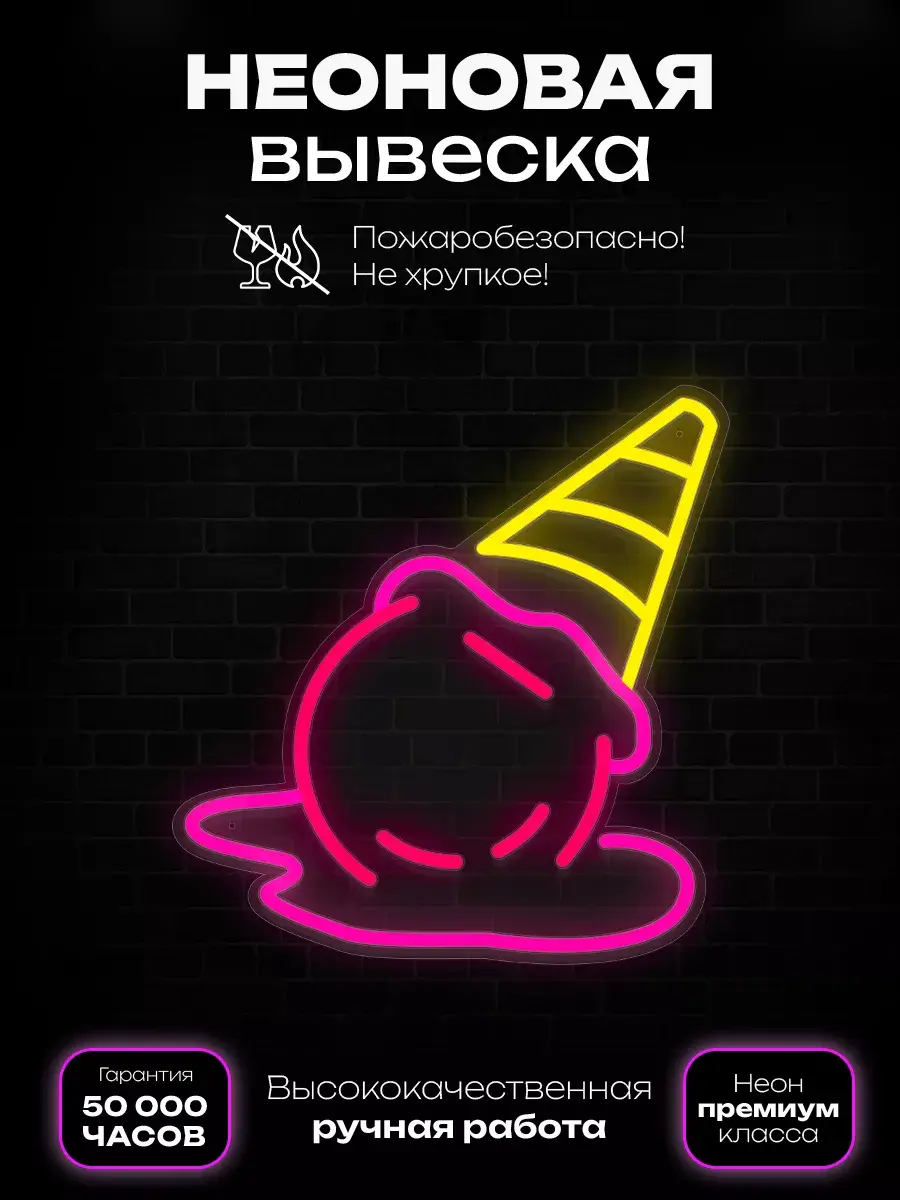 Вывеска «Мороженое» точно привлечёт внимание посетителей в жаркий летний день. «Тающий рожок» — это неоновая вывеска, которая представляет собой яркое и завораживающее произведение искусства. Она словно рассказывает свою собственную историю. Благодаря ярким цветам и креативному дизайну, эта вывеска привлекает взгляды прохожих и создаёт удивительную атмосферу вокруг себя. Её неповторимый свет и необычная форма делают её идеальным акцентом для любого заведения или магазина. Она добавляет немного волшебства и загадочности в повседневную жизнь.