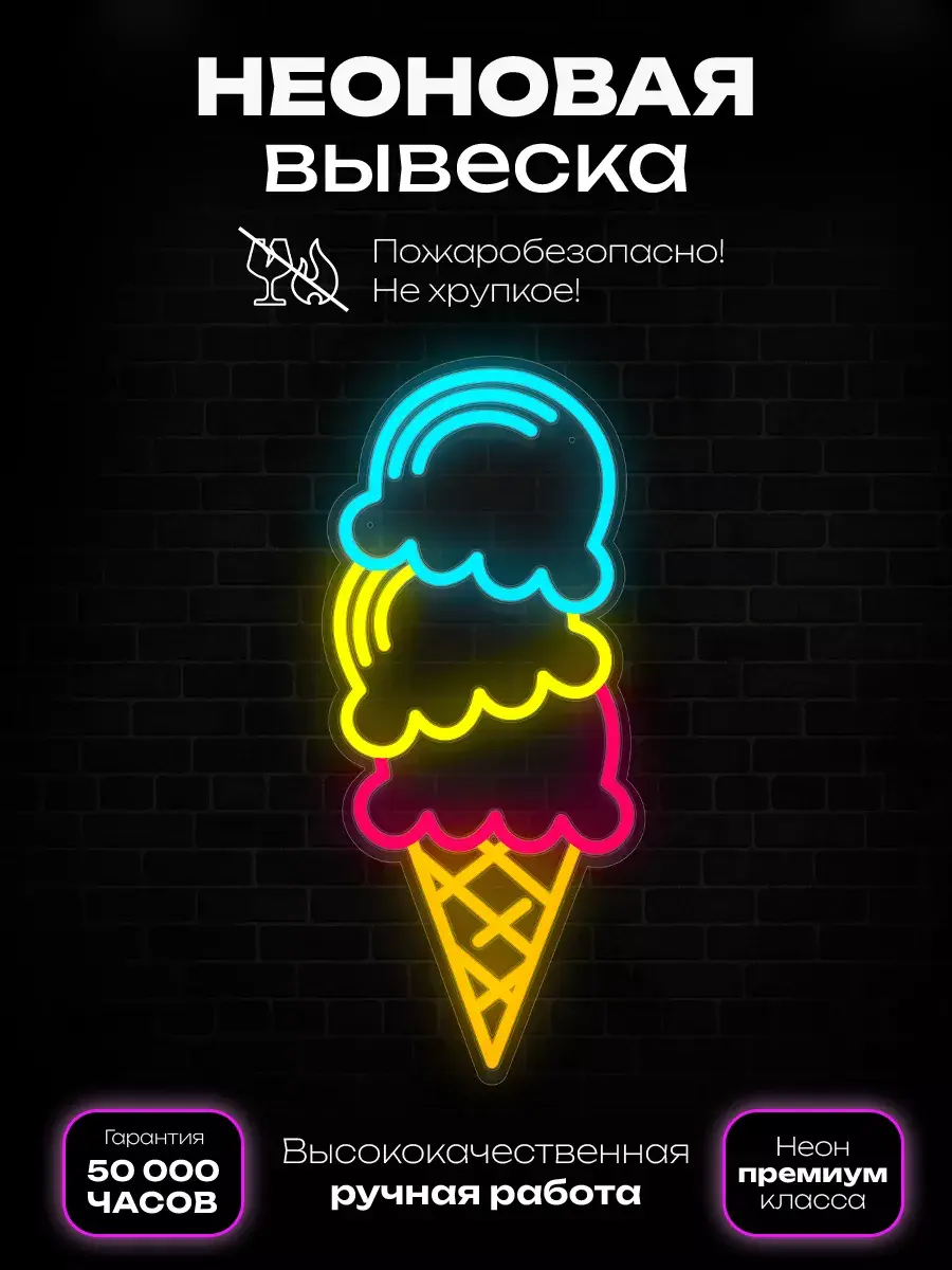 Летом вас будет привлекать вывеска «Мороженое». Она выполнена в виде большого рожка с тремя разноцветными шариками мороженого. Для изготовления этой вывески мы использовали неон 2.0.