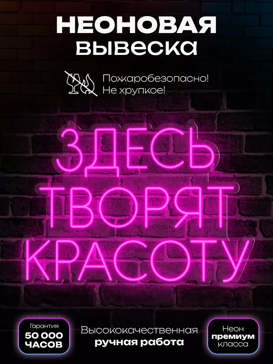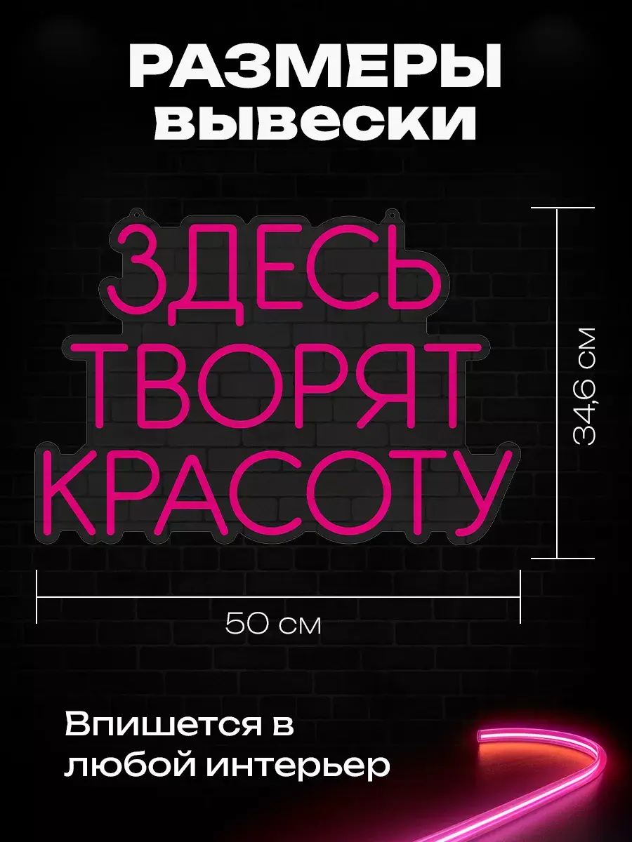 Неоновая вывеска «Здесь творят красоту» — это потрясающее зрелище, особенно в тёмное время суток. Она создаёт неповторимую сказочную атмосферу и привлекает внимание клиентов.