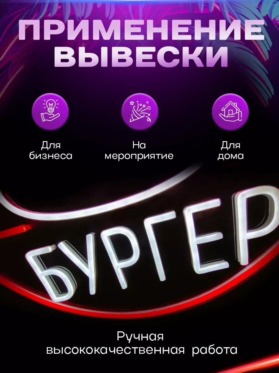 Неоновая вывеска "Бургер" – это яркий и стильный элемент декора, который станет отличным дополнением к любому заведению, связанному с общественным питанием. На вывеске изображены основные ингредиенты бургера – котлета, лист салата, помидор и сыр на фоне стилизованной булочки. Все элементы выполнены в ярких неоновых цветах. Световая панель с изображением бургера – это не только источник дополнительного декоративного освещения, но и яркий инструмент для привлечения клиентов. Вывеска используется внутри помещения, в окне, чтобы привлечь внимание прохожих и создать атмосферу веселья и праздника.