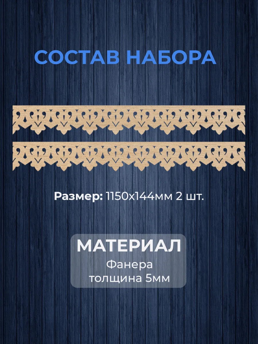 Ажурный фризовый обналичник из высококачественной фанеры предназначен для декоративного оформления дома. Комплект включает элементы, которые идеально подходят для выделения фасада, подчеркивают архитектурный стиль и индивидуальность здания. Точные размеры и продуманный контур облегчают монтаж, обеспечивая аккуратное прилегание к поверхности. Использование этого украшения позволяет гармонично завершить внешний вид дома и придать фасаду элегантность.