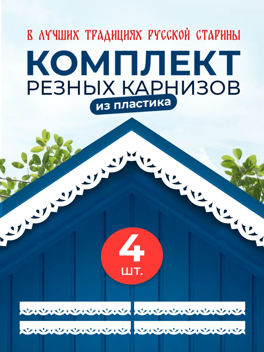 Фриз служит не только декоративным элементом, но и защищает фасад дома от попадания влаги и грязи. Комплект подходит как для новых домов, так и для обновления внешнего вида уже существующих сооружений. Ажурная обналичка украсит дом, гармонично сочетаясь с общим оформлением, подчеркивая крышу.