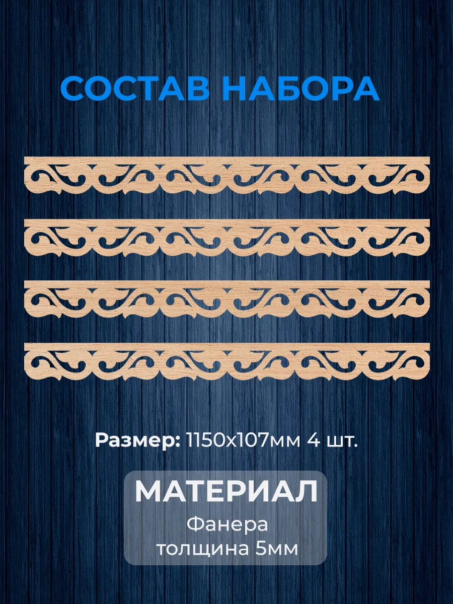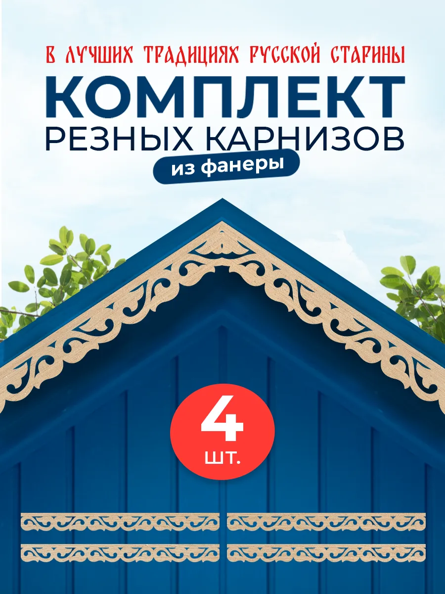 Ажурный фризовый обналичник из высококачественной фанеры предназначен для декоративного оформления дома. Комплект включает элементы, которые идеально подходят для выделения фасада, подчеркивают архитектурный стиль и индивидуальность здания. Точные размеры и продуманный контур облегчают монтаж, обеспечивая аккуратное прилегание к поверхности. Использование этого украшения позволяет гармонично завершить внешний вид дома и придать фасаду элегантность.