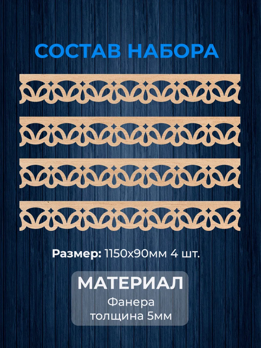 Ажурный фризовый обналичник из высококачественной фанеры предназначен для декоративного оформления дома. Комплект включает элементы, которые идеально подходят для выделения фасада, подчеркивают архитектурный стиль и индивидуальность здания. Точные размеры и продуманный контур облегчают монтаж, обеспечивая аккуратное прилегание к поверхности. Использование этого украшения позволяет гармонично завершить внешний вид дома и придать фасаду элегантность.