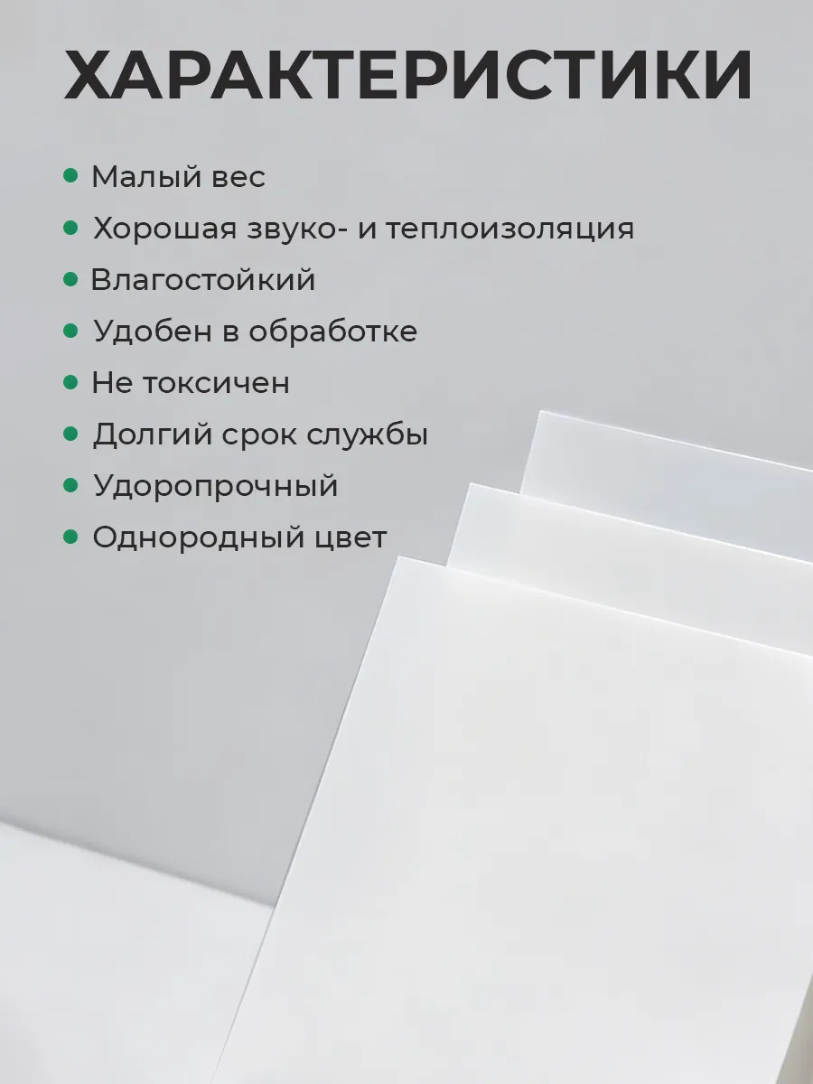 Белый пластик отличается устойчивостью к влаге, не подвержен деформациям при изменении температуры, что обеспечивает долговечность изделий. Листы легко разрезать, сверлить и клеить, что открывает широкие возможности для самостоятельного изготовления декоративных панелей, табличек, разделителей, а также деталей для ремонта или реставрации мебели. Материал не требует специального ухода и сохраняет привлекательный внешний вид на протяжении длительного времени.