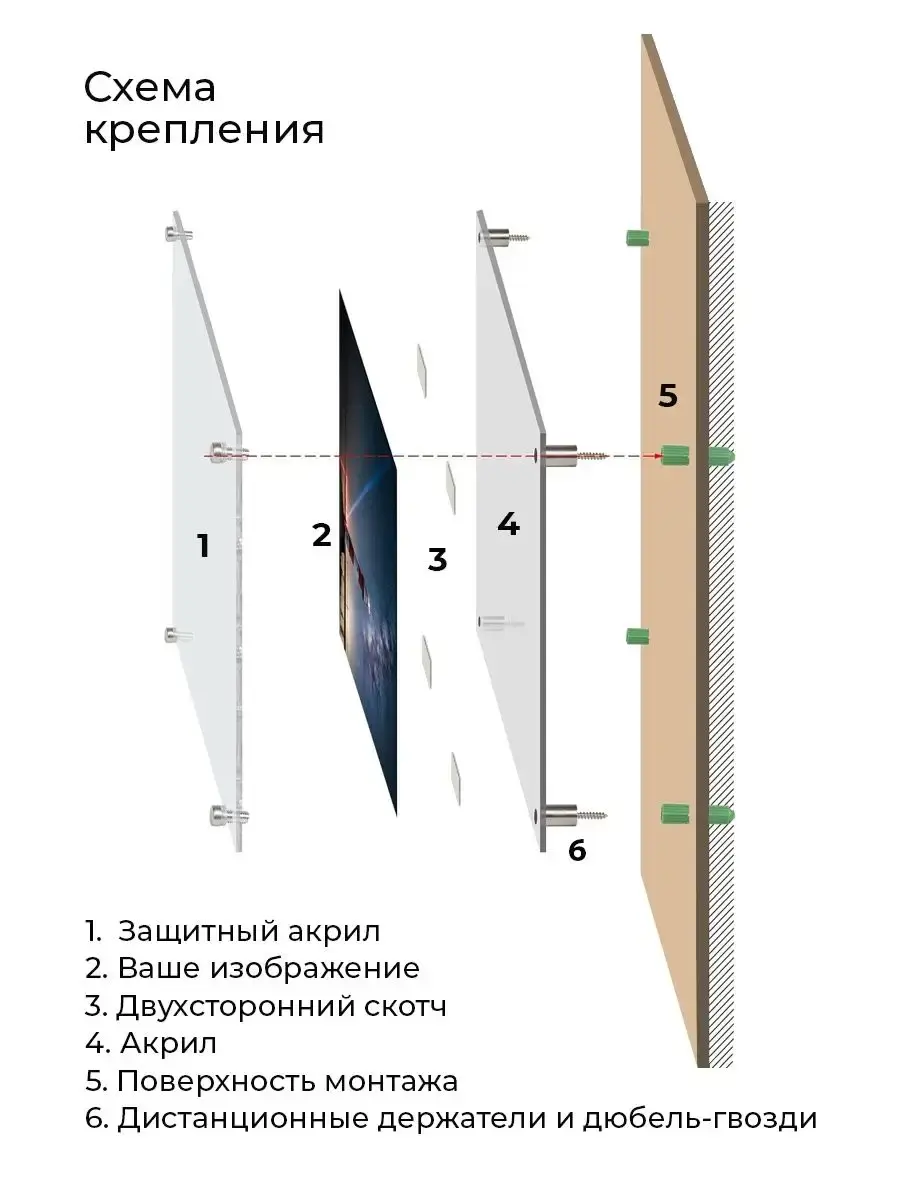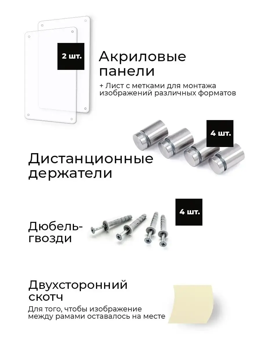 Комплектация: акриловые листы 357х480 мм 2 шт., дистанционные держатели металлические с хромированным покрытием диаметр 12 мм, дюбель-гвозди 4 шт., двухсторонний скотч и монтажный лист.
