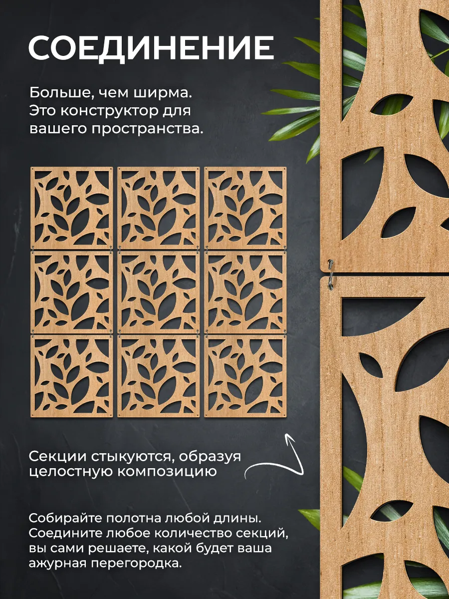 Межкомнатная декоративная перегородка служит не только для зонирования комнат, но и как самостоятельный элемент интерьерного декора. Конструкция ширмы разработана с учетом удобства монтажа: настенное крепление гарантирует надежную фиксацию, а модульная система позволяет адаптировать размер под разные параметры помещения. Деревянные элементы выполнены в экостиле, разнообразность макетов можно миксовать между собой, что обеспечит еще большую эстетичность изделия.