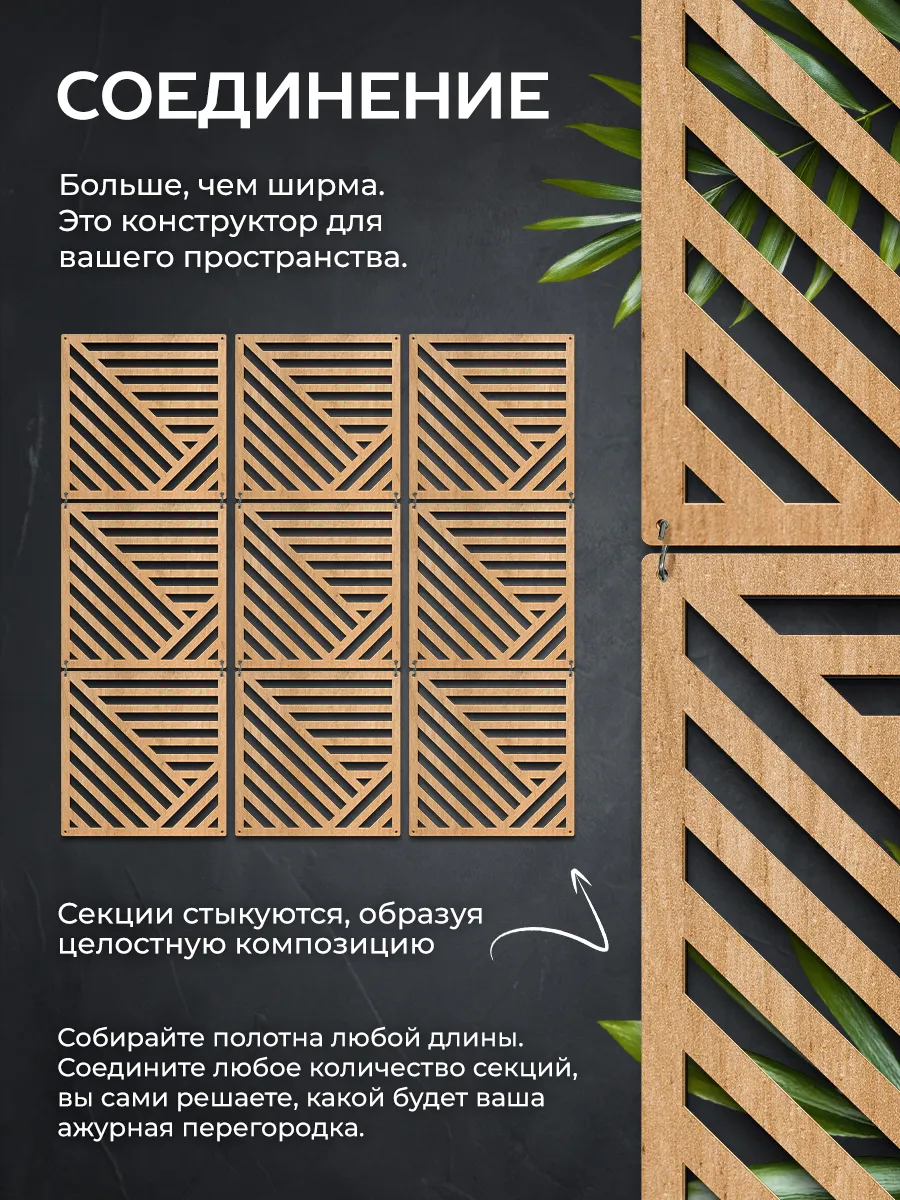 Межкомнатная декоративная перегородка служит не только для зонирования комнат, но и как самостоятельный элемент интерьерного декора. Конструкция ширмы разработана с учетом удобства монтажа: настенное крепление гарантирует надежную фиксацию, а модульная система позволяет адаптировать размер под разные параметры помещения. Деревянные элементы выполнены в экостиле, разнообразность макетов можно миксовать между собой, что обеспечит еще большую эстетичность изделия.