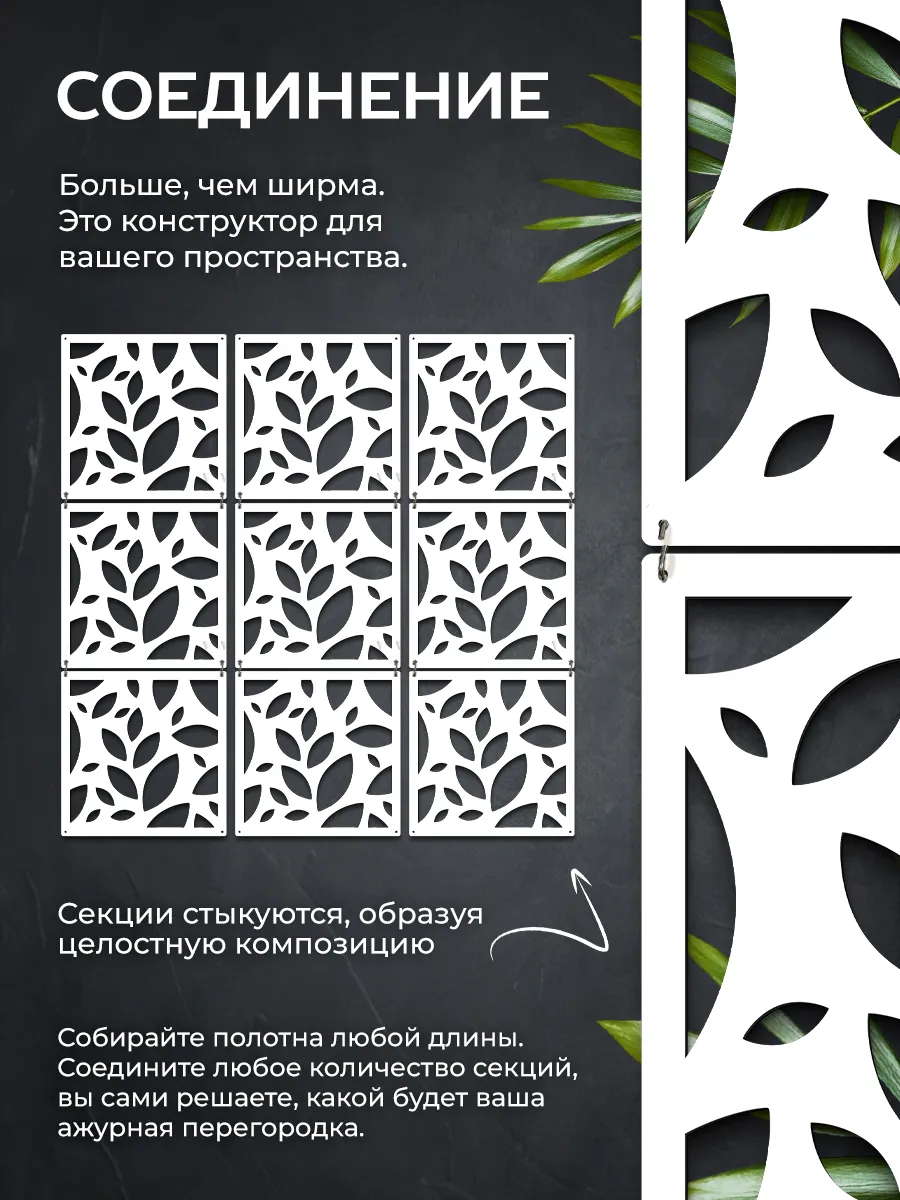 Межкомнатная декоративная перегородка служит не только для зонирования комнат, но и как самостоятельный элемент интерьерного декора. Конструкция ширмы разработана с учетом удобства монтажа: настенное крепление гарантирует надежную фиксацию, а модульная система позволяет адаптировать размер под разные параметры помещения. Пласиковые элементы выполнены в современном стиле, разнообразность макетов можно миксовать между собой, что обеспечит еще большую эстетичность изделия.