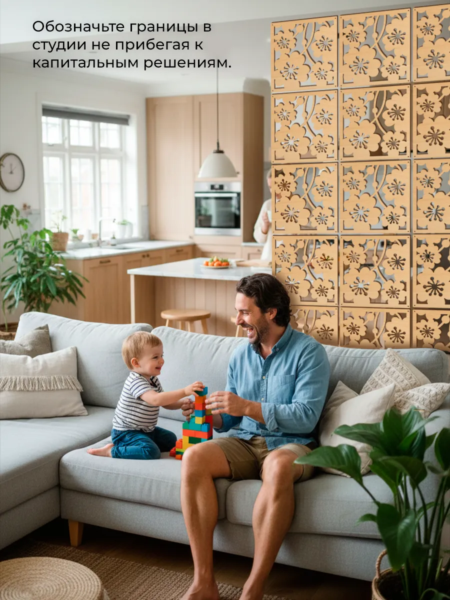 Межкомнатная декоративная перегородка служит не только для зонирования комнат, но и как самостоятельный элемент интерьерного декора. Конструкция ширмы разработана с учетом удобства монтажа: настенное крепление гарантирует надежную фиксацию, а модульная система позволяет адаптировать размер под разные параметры помещения. Деревянные элементы выполнены в экостиле, разнообразность макетов можно миксовать между собой, что обеспечит еще большую эстетичность изделия.