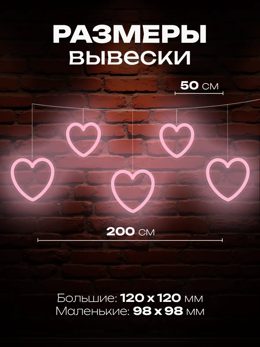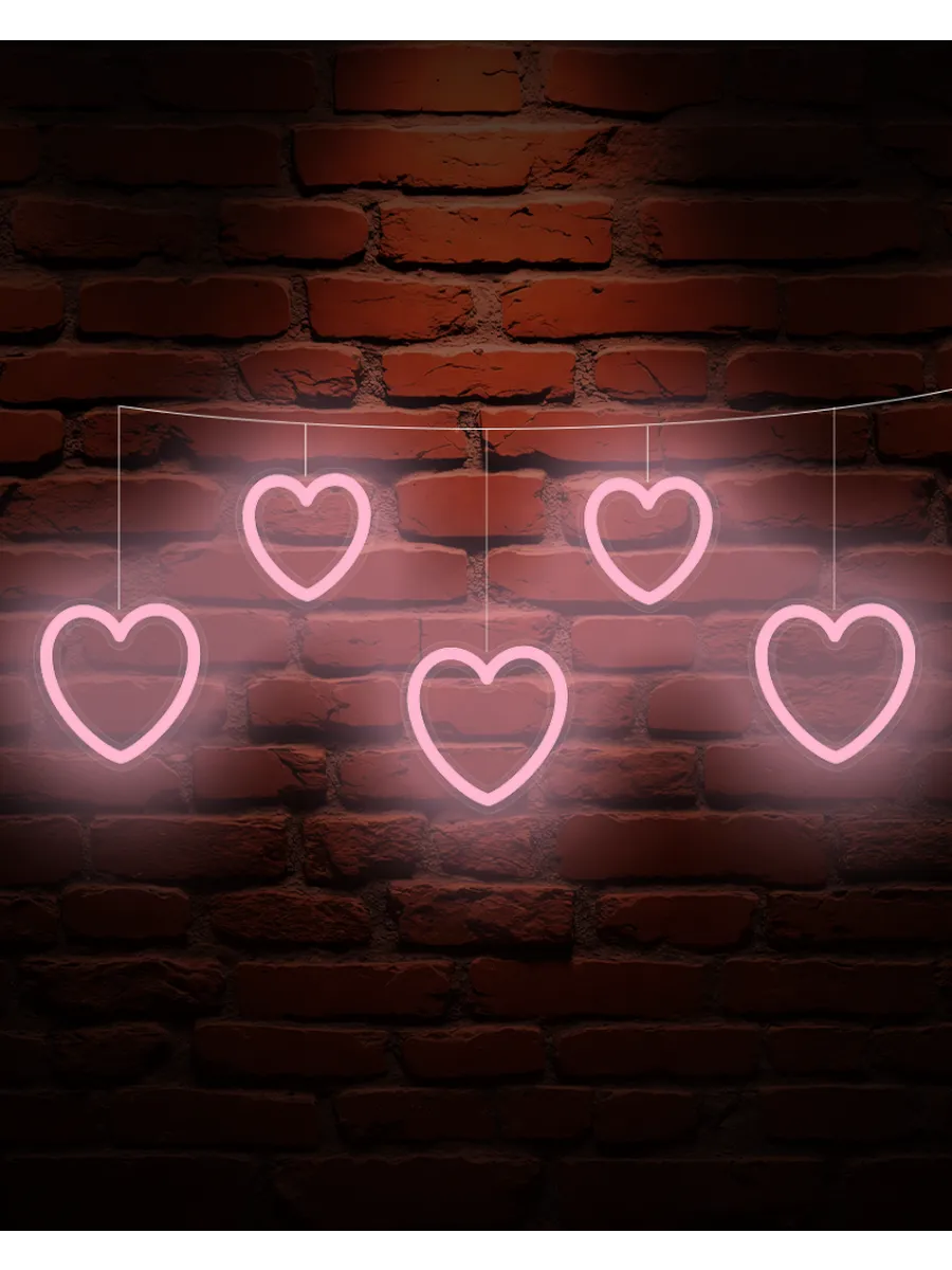 Гирлянда выполнена в виде пяти сердечек, поэтому добавляет комнате романтики и тепла. Светильник из неона легко крепится, не требует специальных инструментов, а значит оформление любой стены займет считанные минуты. Благодаря неону световой декор долговечен, не нагревается и абсолютно безопасен даже для малышей.